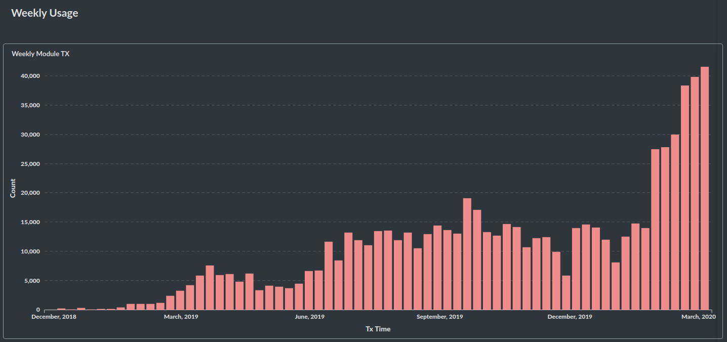 The above chart shows growth in weekly module transactions on the blockchain. Module transactions are those with a user data payload.
