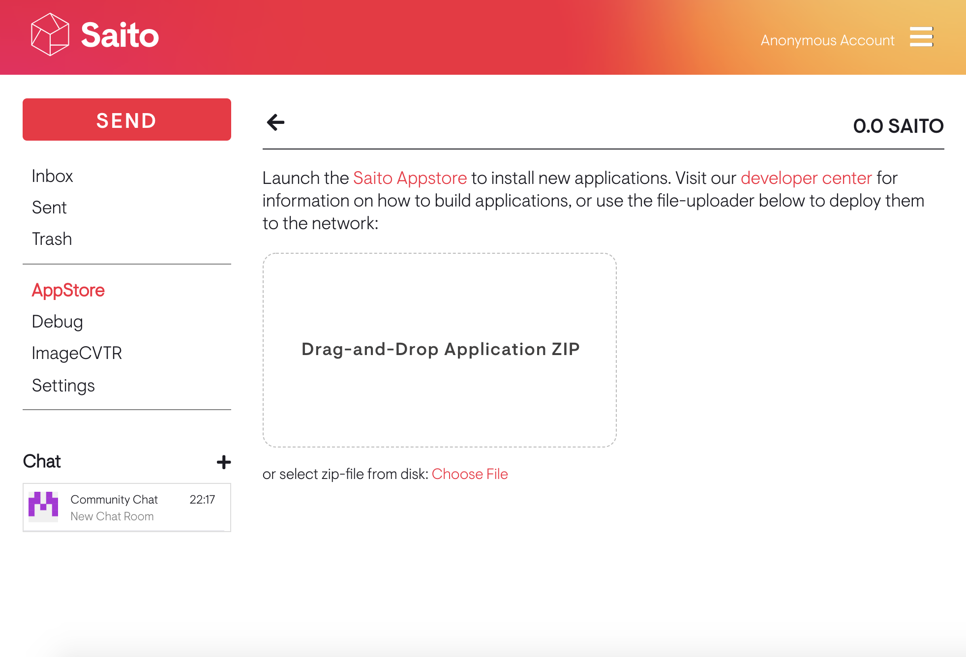 Visit your Saito Wallet and click on “AppStore” in the application sidebar. We want to upload our new application, so drag that zipfile onto the drag-and-drop upload panel. This transfers the file into your browser and wraps it in a Saito transaction. A submit button will appear when this process is done. Click it.