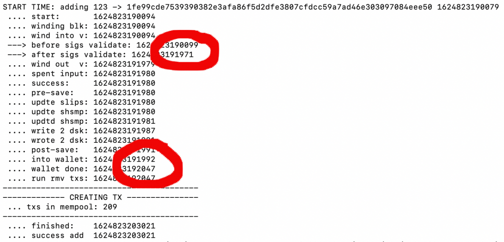 There are three critical bottlenecks that affect our non-Rust implementation: (1) saving blocks to disk, (2) loading blocks from disk, and (3) validating blocks (and transactions). We can’t see the delays in blocks getting saved here because that is happening asynchronously and behind-the-scenes. But we can see that hashing transaction-affixed data and checking those transaction signatures is taking a huge amount of processing time. There are some less obvious lessons too — it is interesting to know that our Google Dense Hashmap is not even breaking a sweat in handling UTXO updates but that our wallet is already starting to struggle, suggesting that core routing nodes shouldn’t even do that work by default.