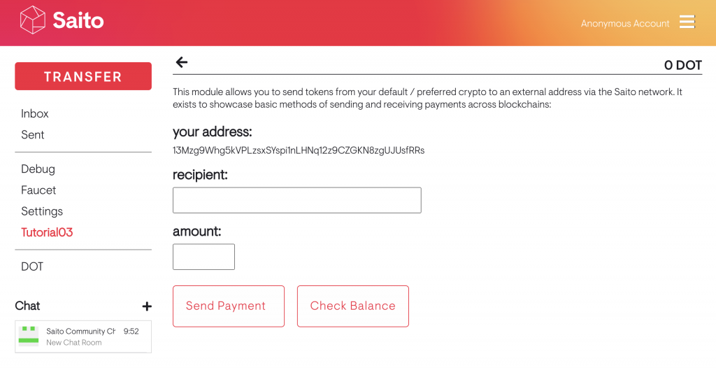 In this tutorial we create a wallet plugin that can send and receive other cryptocurrencies like Polkadot. We explain how to use the /lib directory to handle more complicated user interfaces. And we learn a bit about the standard Saito UI library. As before, we recommend downloading the finished zipfile or walking through our annotated online code. This is what we are building.