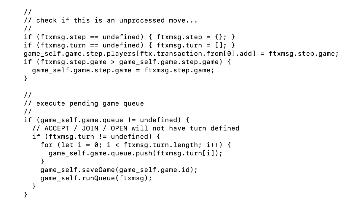 A major improvement that has added stability in these cases is a new feature we call “future moves” support. In addition to making it obvious to the game engine when players should be taking their turns, this solves a fundamental issue that occurs in games like Red Imperium where multiple players are invited to move at the same time (i.e. several players simultaneouslty respond to another player’s action). Saito now has the ability to receive moves out-of-order and piece them back into a coherent agreed-upon state. Here is some of the lovely code:
