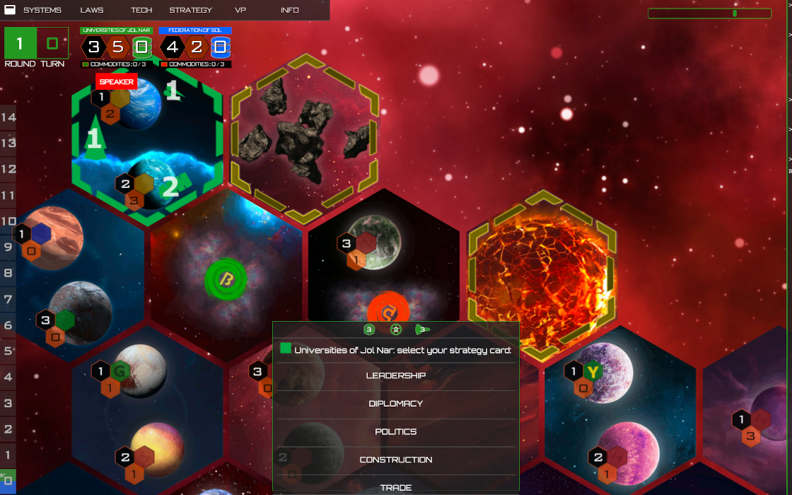 Red Imperium is an open source space-civilization game that uses the base mechanics from the utterly-epic 16-hour boardgame Twilight Imperium. As you can see from the screenshot below, the game has entirely new graphics (we think they look great!) a streamlined user-interface, and a provably-fair cryptographic backend like everything else at the Saito Arcade (https://saito.io/arcade).