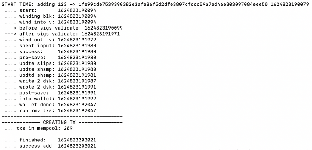 There are three critical bottlenecks that affect our non-Rust implementation: (1) saving blocks to disk, (2) loading blocks from disk, and (3) validating blocks (and transactions). We can’t see the delays in blocks getting saved here because that is happening asynchronously and behind-the-scenes. But we can see that hashing transaction-affixed data and checking those transaction signatures is taking a huge amount of processing time. There are some less obvious lessons too — it is interesting to know that our Google Dense Hashmap is not even breaking a sweat in handling UTXO updates but that our wallet is already starting to struggle, suggesting that core routing nodes shouldn’t even do that work by default.