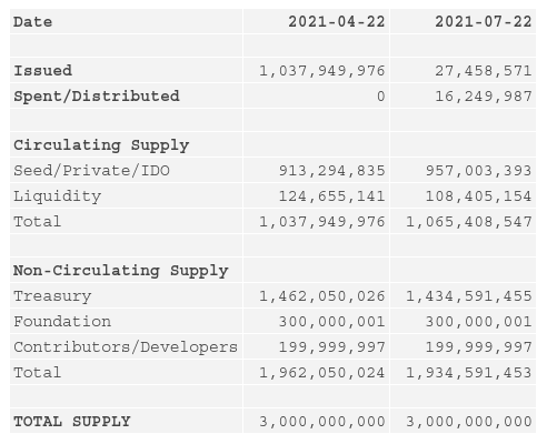 Vesting and disbursements between 2021–04–22 and 2021–07–22 resulted in a 2.64% increase in circulating supply.